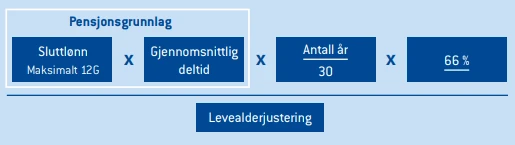Selve beregningen er relativt kompleks, blant annet på grunn av levealdersjustering og samordning med ytelser fra Nav. Vi anbefaler at du benytter pensjonskalkulatoren i medlemsportalen for å få en prognose på fremtidig alderspensjon. Du kan også bestille veiledningssamtale eller kontakte oss på telefon eller epost.